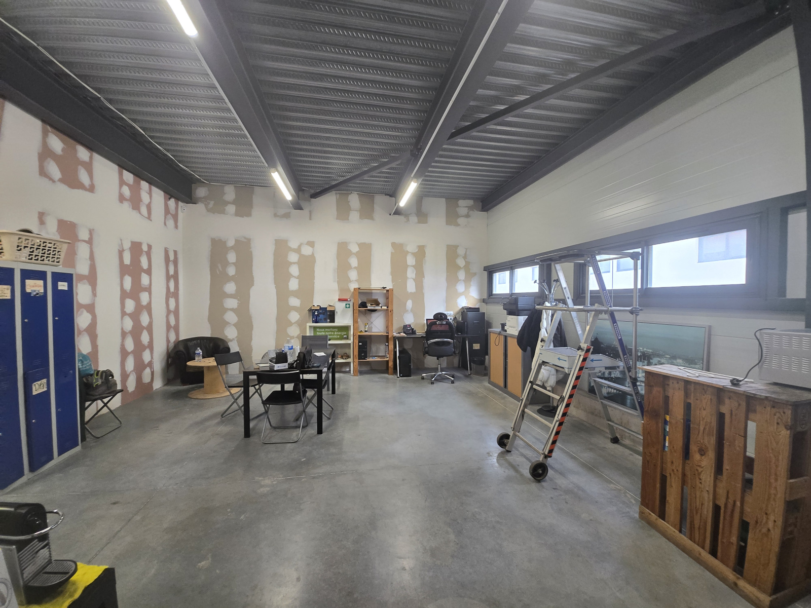 - 150 m² en RDC composé d'un espace de stockage et d'une partir locaux sociaux avec 2 sanitaires (Code du Travail).