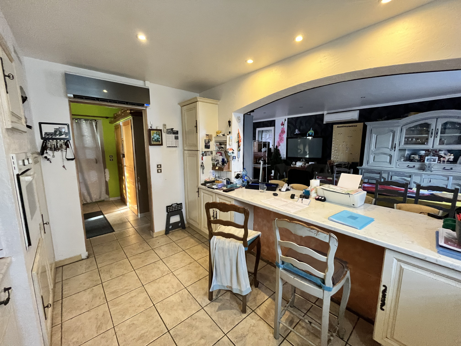 Rez-de-chaussée : vaste entrée, cuisine équipée ouverte sur salon/séjour lumineux, salle de bain (baignoire + douche), WC séparés, accès sous-sol et étage.