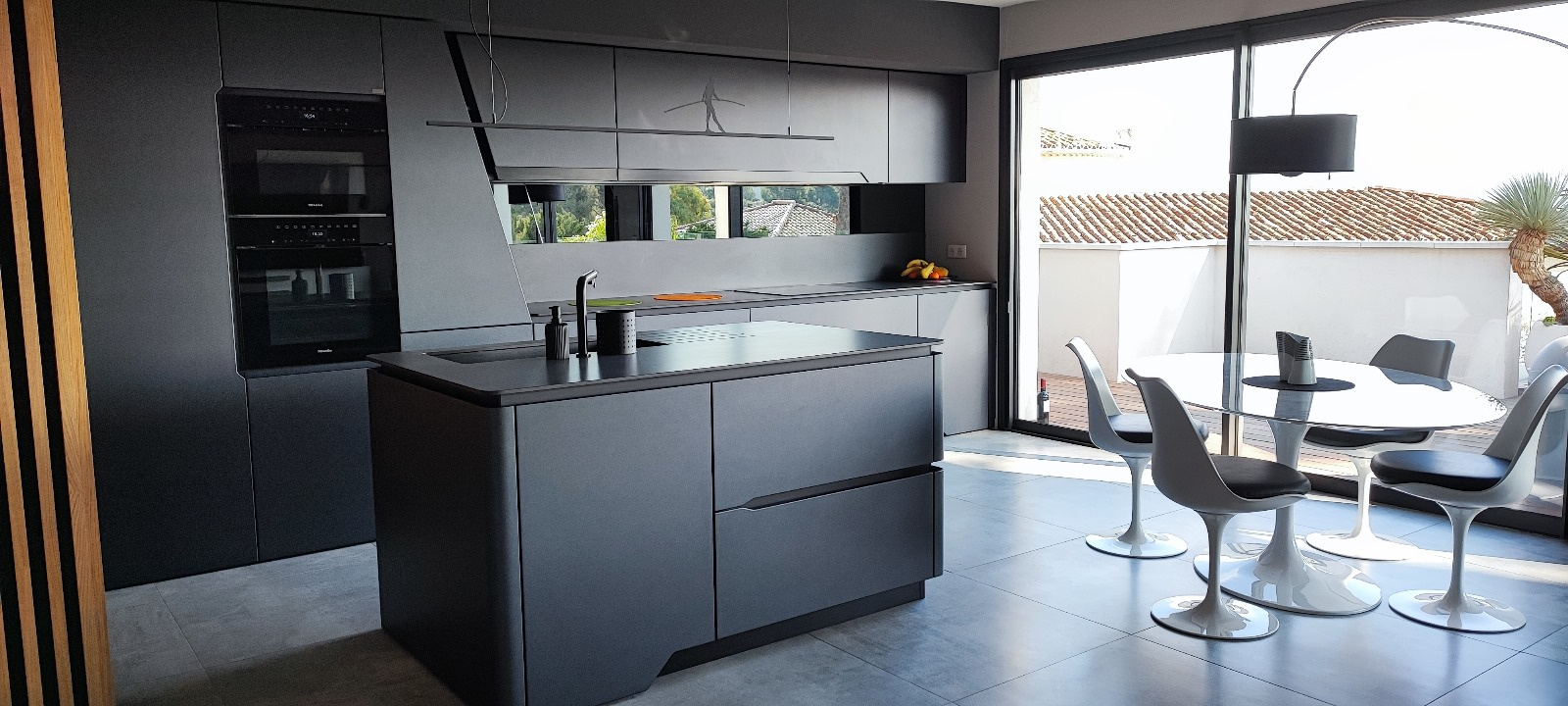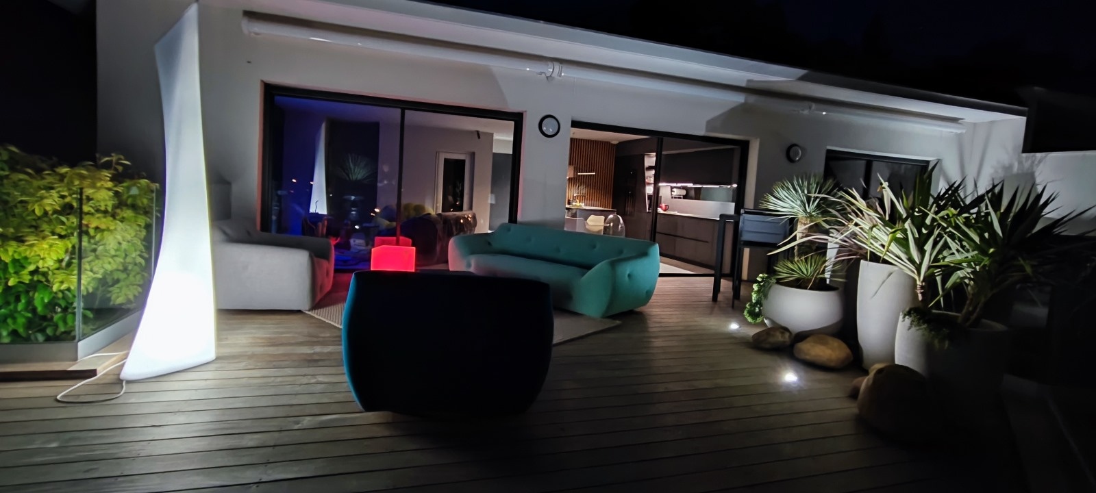 L'entrée s'ouvre sur un bel espace de vie articulé autour d'une cuisine au design sculptural et fonctionnel, et un lumineux séjour prolongé par une élégante terrasse en teck de 63 M2.