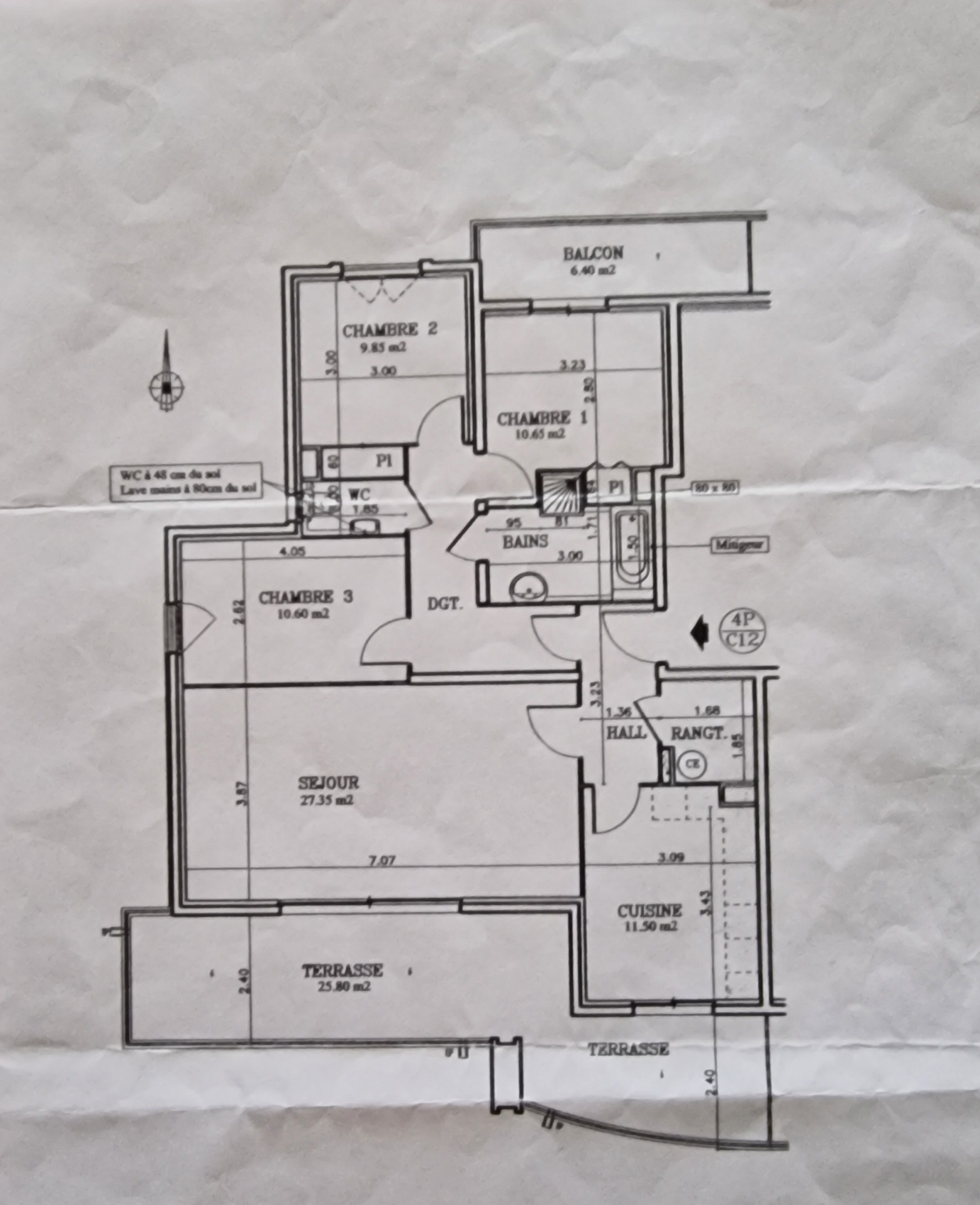 Appartement T4 de 91m² en vente sur Hyères, quartier La Gare. Il comprend 3 chambres, un séjour donnant sur une terrasse de 25m² exposée sud, une cuisine indépendante, un cellier, une salle d'eau et WC.